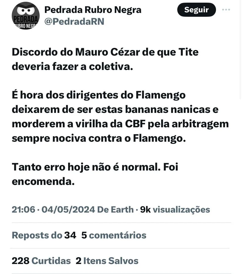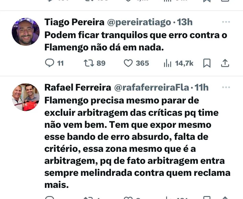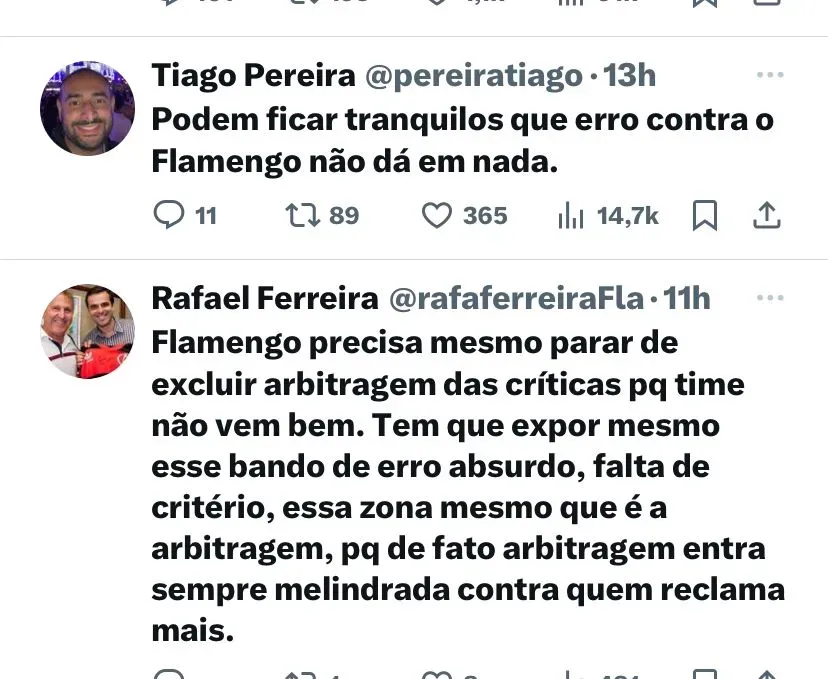 “A gente acha o que está acontecendo um acinte. O presidente de um clube diz que tem fraude, o outro diz que tem assalto… e jogo após jogo os árbitros, acuados, vão prejudicando o Flamengo. É um absurdo. O que mais é acintoso é a falta de critério e sempre contra o Flamengo. Não consigo achar que isso é normal e que não tenha algo por trás. Todos os lances vão se acumulando”, disse.