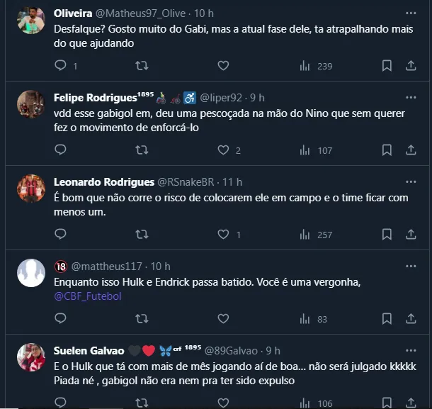 Dito isso, embora a própria expulsão de Gabi tenha sido bastante questionada pelo torcedor, o Superior Tribunal de Justiça Desportiva denunciou e ambos serão julgados na próxima terça-feira (5), às 10h.