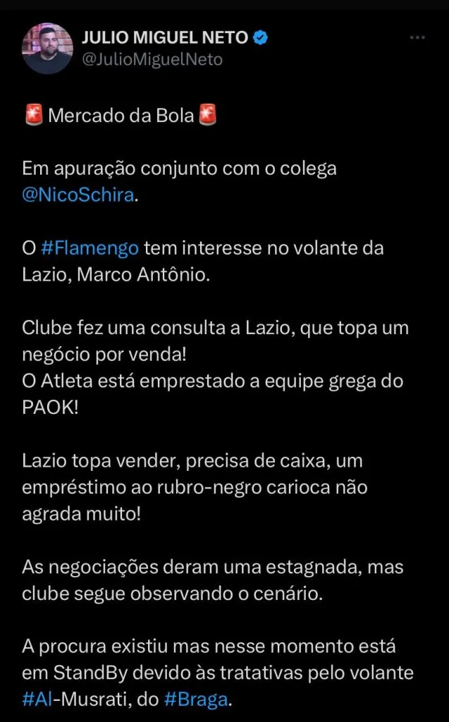 Foi noticiada na manhã desta quarta-feira (24), que o time carioca tem um novo alvo para reforçar ainda mais o time. A informação foi trazida pelo jornalista Júlio Miguel Neto, através do X (antigo Twitter).
