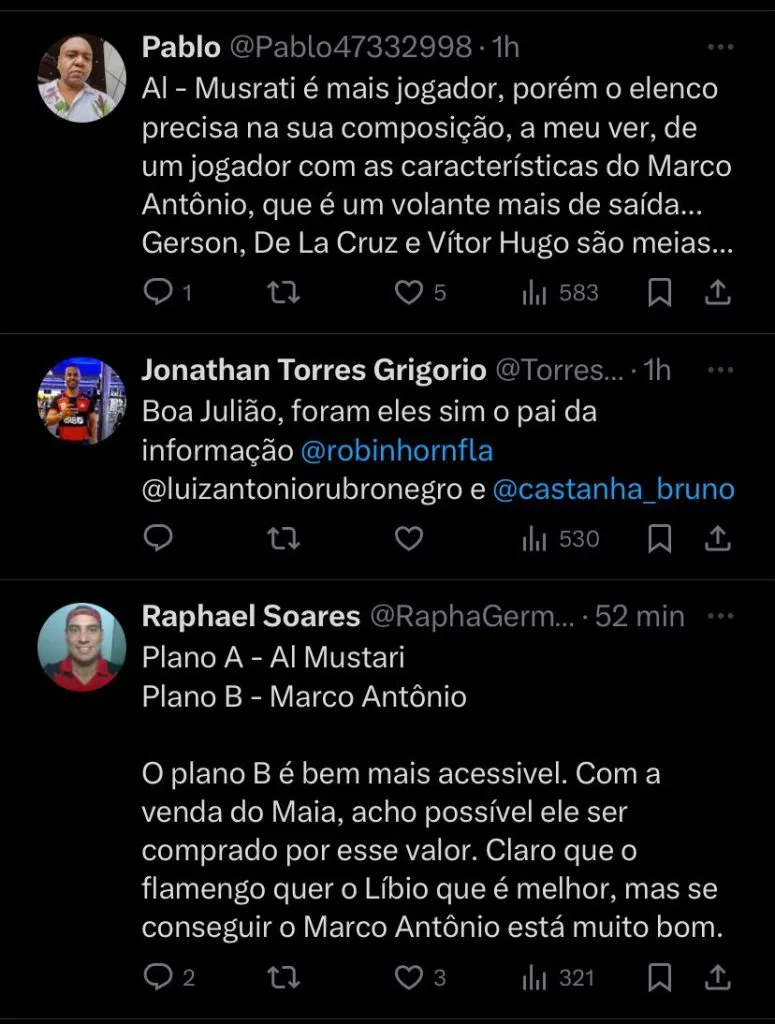 Com a notícia de um novo nome, obviamente, a Nação não perdeu tempo e começou a falar sobre o volante: (SIC) “Coloca no mesmo avião que o Viña”; “Plano A – Al Mustari, Plano B – Marcos Antônio. O plano B é bem mais acessivel. Com a venda do Maia, acho possível ele ser comprado por esse valor. Claro que o flamengo quer o Líbio que é melhor, mas se conseguir o Marco Antônio está muito bom.”, foram alguns comentários da torcida.