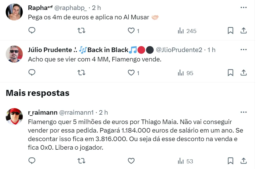 “O Internacional não desistiu do Thiago Maia. Coudet quer muito o jogador e os Colorados vão apresentar uma nova oferta ao Flamengo. Os números, no entanto, não devem chegar aos 5 milhões de euros”, disse Raisa no X (antigo Twitter).
