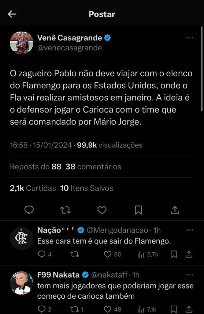 Diante disso, foi informado nesta segunda-feira (15) por Venê Casagrande através do X (antigo Twitter), Tite não deverá levar o zagueiro Pablo para o torneio no exterior.