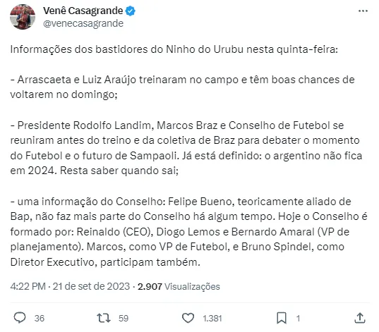 Segundo informação divulgada pelo jornalista Venê Casagrande nesta quinta-feira (21), às 16h22, o Flamengo não vai manter Jorge Sampaoli para 2024. A decisão foi tomada de uma vez após certa dúvida sobre o destino do profissional. Existe ainda a falta de conhecimento sobre o momento exato em que o profissional vai deixar o comando do time. Porém, a Nação já ganhou um motivo para comemorar logo.