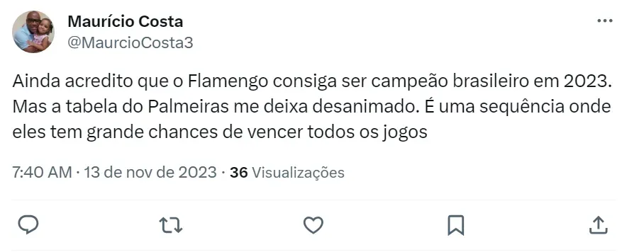 O Rubro-Negro tem cinco pontos a menos que o líder Palmeiras, mas com um jogo a menos ainda alimenta a esperança de ganhar a competição. De acordo com estudo da UFMG, as chances de título do Mengão são de 3,5%.