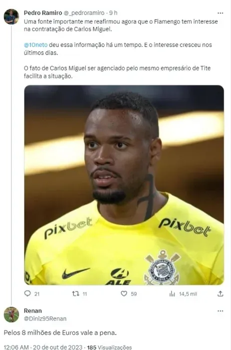 Nessa linha, de acordo com informações apuradas pelo jornalista Pedro Ramiro, que recebeu uma confirmação de uma fonte importante, o Mais Querido tem interesse na contratação de Carlos Miguel, atual reserva imediato de Cássio. Vale lembrar que o goleiro é tratado como um “xodó” pela torcida do Corinthians, pois sempre rendeu muito quando recebeu oportunidades na ausência do titular.