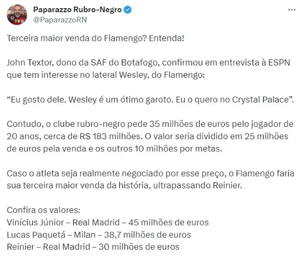 Ainda conforme o perfil, o valor seria dividido em 25 milhões de euros pela venda e os outros 10 milhões por metas estipuladas no contrato. Nessas condições, o Flamengo faria sua terceira maior venda da história, ultrapassando Reinier.