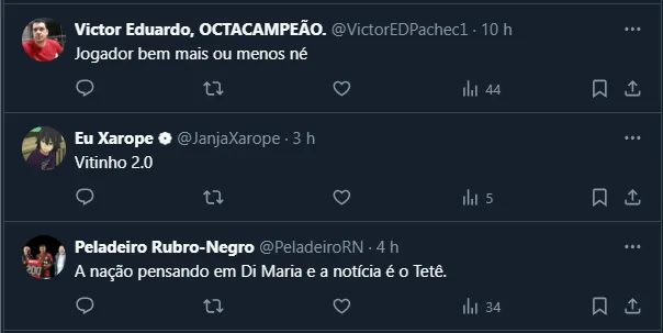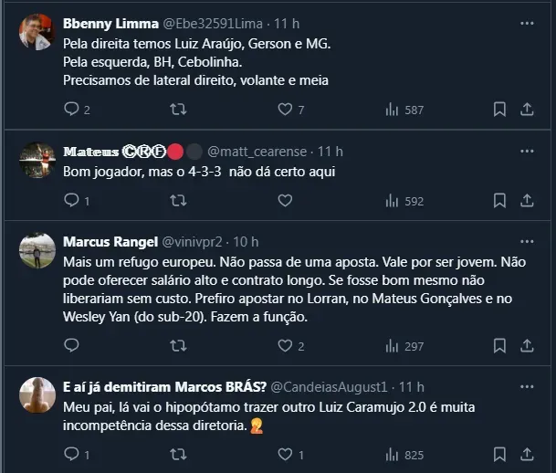 Entretanto, até pela função e pela posição que atua, os flamenguistas não ficaram nada empolgados com a possível contratação. Inúmeros foram às redes sociais criticar a movimentação.