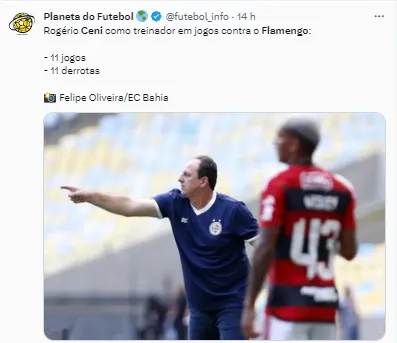 O Flamengo venceu o Bahia e mais uma vez saiu de campo sem ser derrotado pelo treinador Rogério Ceni, que já comandou o time. A partida gerou muita bronca pelo lado do Esquadrão de Aço, que se sentiu prejudicado na partida por um lance polêmico. Na coletiva, o comandante do time nordestino falou sobre isso.