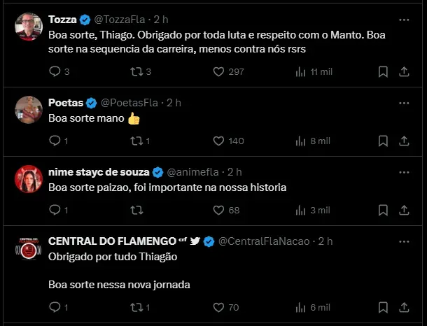 “Obrigado por tudo, Thiago! Boa sorte na sua nova etapa“, comentou uma torcedora do Mengão. Ayrton Lucas também deixou uma mensagem: “Deus abençoe, irmão“.
