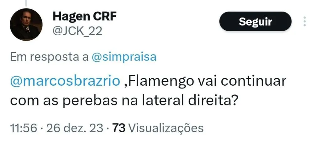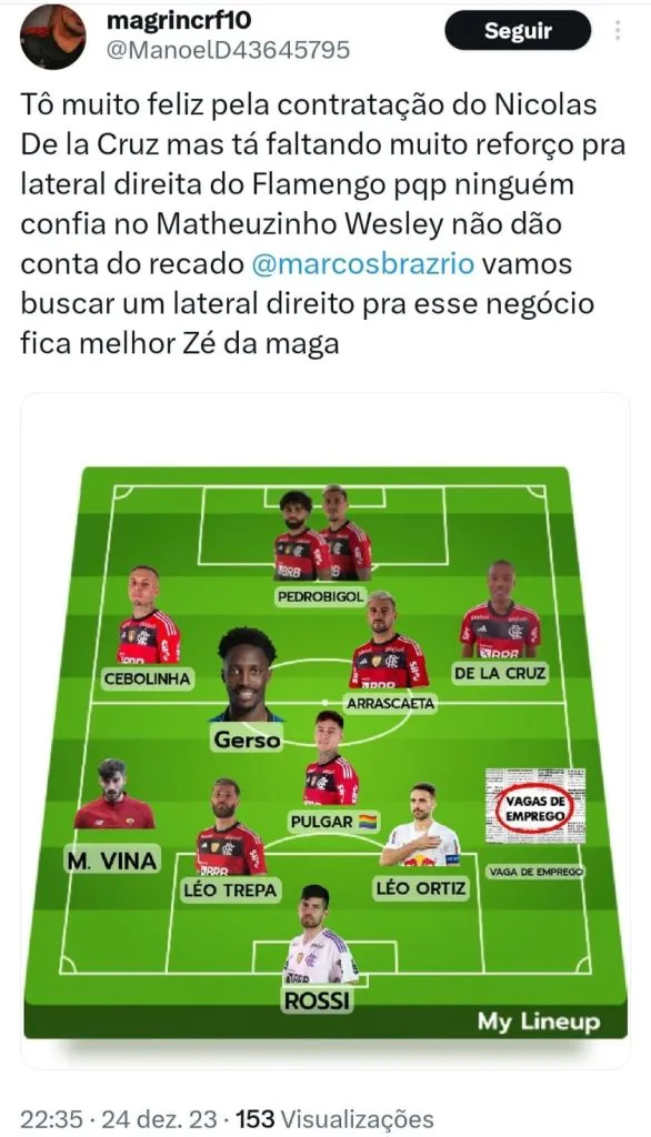 “(Escalaria) Rossi, tentaria o Varela, Fabrício Bruno, Léo Pereira e Ayrton Lucas; Pulgar, Allan, Arrascaeta e De La Cruz; Bruno Henrique e Pedro. 4-4-2. O Tite vai no 4-3-3. Eu acho que essa seria uma formação bem interessante para o Flamengo.”, completou.