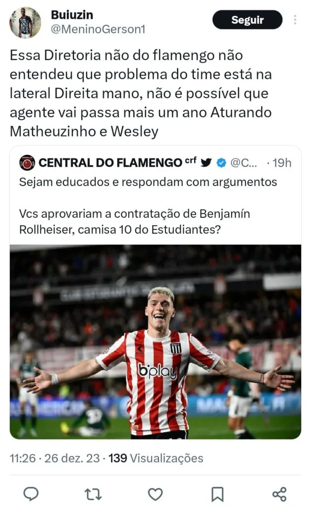 “O Viña e o Léo Ortiz (são os próximos alvos). Eu acho que o Flamengo tinha que batalhar a compra de um ótimo lateral-direito. Vai ficar com dois laterais-esquerdo de ótimo nível, e nenhum na direita porque nenhum se firmou.”, pontuou.
