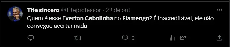 Entretanto, o comandante vem trabalhando nos bastidores buscando a evolução de jogadores que estão em baixa na equipe. Para 2024 a gestão vem buscando uma reformulação, para rejuvenescer a equipe com objetivo na conquista de títulos. Com isso, Tite vem trabalhando de forma individual no elenco para elevar o desempenho dos atletas. Dentre eles, Everton Cebolinha, que ainda não conseguiu demonstrar uma atuação contundente.