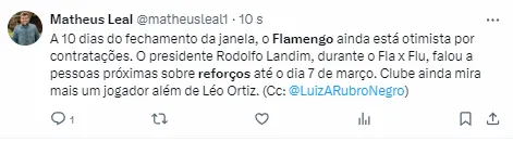 Outros nomes foram especulados na equipe, mas até agora, não teve acerto com nenhum. A grande novela é sobre o zagueiro Léo Ortiz, do Red Bull Bragantino.