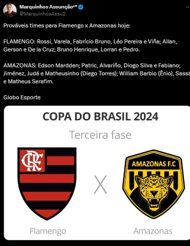 Na noite desta quarta-feira (1°), às 21h30, o Flamengo encara o Amazonas pela partida de ida da terceira da fase da Copa do Brasil. O Mengão quer dar a volta por cima e deixar as duas últimas derrotas para trás.