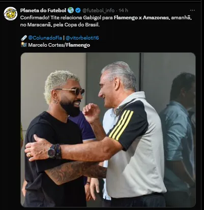 Tite definiu que mesmo sem trabalhar um certo tempo com o elenco flamenguista, Gabriel Barbosa será relacionado e irá ficar no banco de reservas nesta partida. Fica a expectativa para saber se ele fará sua reestreia no Rubro-Negro Carioca.