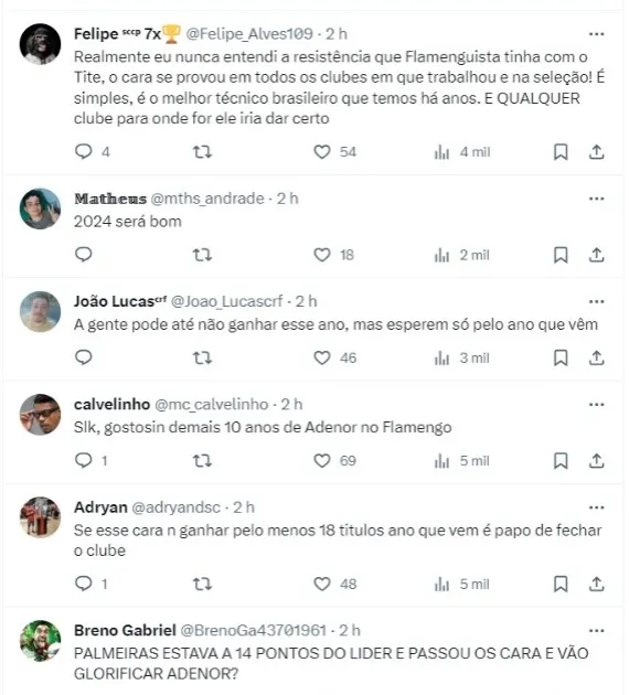 “Depende do Flamengo. Eu sou mais um que participa de uma engrenagem de uma equipe de trabalho muito grande. Eu sou uma das pessoas que buscava esse objetivo. Eu não sei da pontuação. Eu não sei. Eu não quero ficar pensando nos outros porque eu desfoco do meu trabalho. Claro que eu vou torcer contra os que estão na frente, mas eu tenho que isolar e ficar focado no nosso dia a dia e no nosso trabalho”, disse Tite.