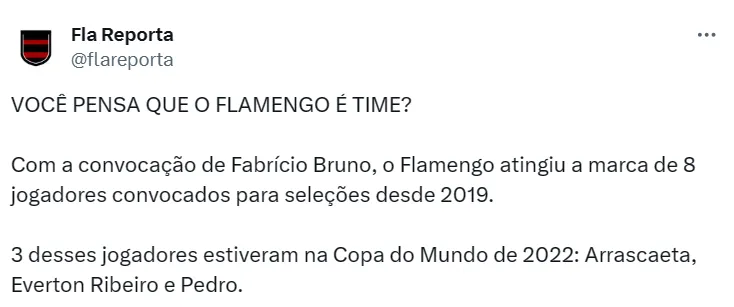 “(Minha relação com a seleção é) fazer o Flamengo arrebentar, ter a melhor produção possível, ter todos os atletas selecionáveis. E que ele (Dorival) possa quebrar a cabeça cada vez mais em poder selecionar e ter grandes atletas em condição técnica à disposição da seleção. Se vamos reclamar, isso é outra história, em uma outra alçada, uma alçada diretiva um pouco acima”, comentou.