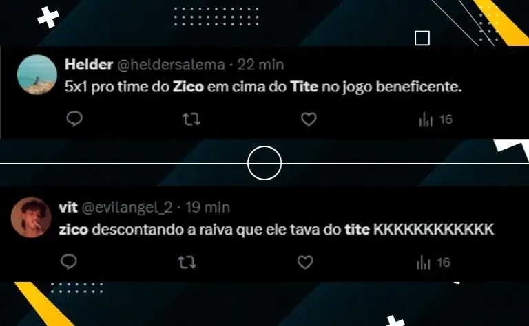 “Quem é rubro-negro hoje dorme feliz mesmo nao tendo o Flamengo… ZICO humilhando o Tite”, postou outro flamenguista. “Zico puniu o Tite em plena Neo Química Arena num domingo à tarde com o Brasil todo assistindo. Ídolo, gênio e rei”, publicou mais um internauta.