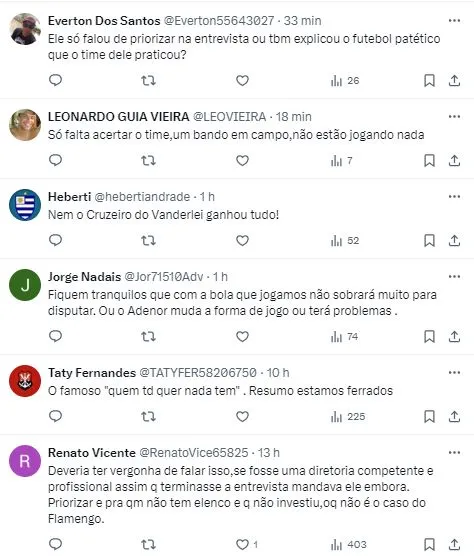 O técnico completou afirmando: “Calma, discernimento e um pouco de sensatez. Os objetivos dos clubes estão acima dos meus individuais. Estou há 30 anos como técnico, eu sei da minha hierarquia abaixo. O que é melhor para o clube nós vamos fazer”.