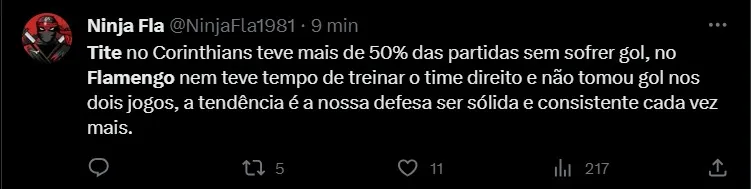 “Logo que os jogadores chegaram no vestiário, o Tite ele tem o costume, e isso foram pessoas lá de dentro que me falaram, o Tite abraçou um por um. Não só os jogadores. (…) Ele faz questão de comemorar com todas as pessoas que estão inseridas ali na comissão do Flamengo. (…) O Flamengo estava destruído mentalmente em relação a grupo e o Tite em pouquíssimo tempo conseguiu acabar com essa situação”, destacou.