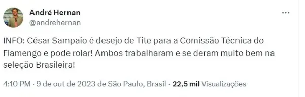 “INFO: César Sampaio é desejo de Tite para a Comissão Técnica do Flamengo e pode rolar! Ambos trabalharam e se deram muito bem na seleção Brasileira!”, escreveu o jornalista que tem canal no YouTube e também participa do Camisa 21 em sua redes sociais no fim da tarde desta segunda-feira (9).