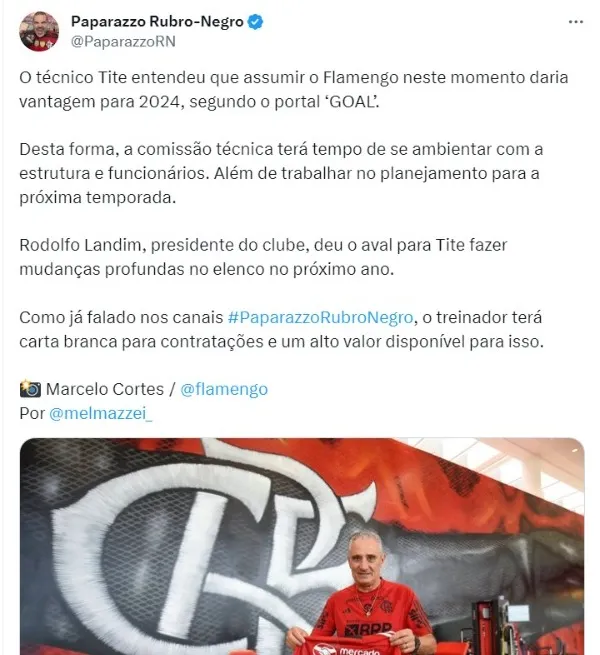 O Flamengo coloca reformulação na mão de Tite e treinador terá autonomia no futebol para a próxima temporada. Rodolfo Landim deu aval para mudanças profundas no elenco em 2024 caso o técnico assim deseje, como ele sempre quis desde o início das negociações.