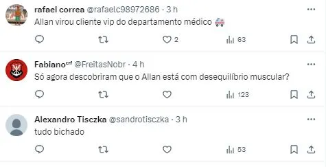 Contudo, o Fla projeta os retornos do trio. De La Cruz, deve estar à disposição na partida diante do Boavista, na próxima terça-feira (20), mesmo caso de Viña. O caso mais complexo é o de Allan, que tem previsão de retorno no Clássico contra o Fluminense, dia 25 de fevereiro.