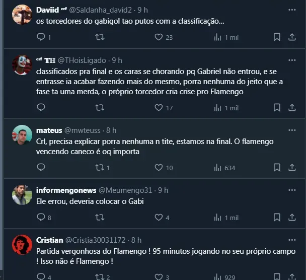 Por fim, após avançar à mais uma decisão, o Mengo agora terá duas semanas para se preparar exclusivamente para as finais. O primeiro jogo da decisão será apenas dia 31, o que também foi tema da coletiva de Tite: