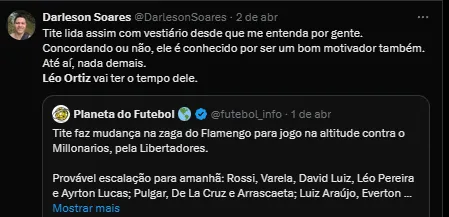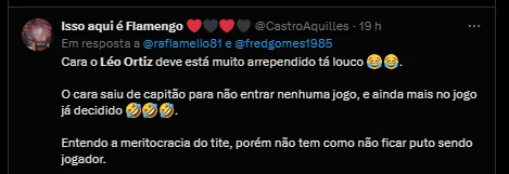Para se ter ideia, na estreia da Copa Libertadores, contra o Millonarios, da Colômbia, Léo Pereira foi poupado, mas o zagueiro não foi utilizado e viu o experiente medalhão David Luiz formar a dupla de zaga ao lado do Fabrício Bruno.