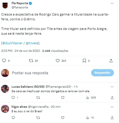 “Depois das declarações do preparador físico Fábio Mahseredjian, a expectativa por uma possível titularidade de Rodrigo Caio aumentou. A chance está aí, com David Luiz lesionado e Fabrício Bruno suspenso contra o Grêmio”, informou o jornalista Guilherme Xavier, do site Trivela, através de uma publicação em seu perfil nas redes sociais.