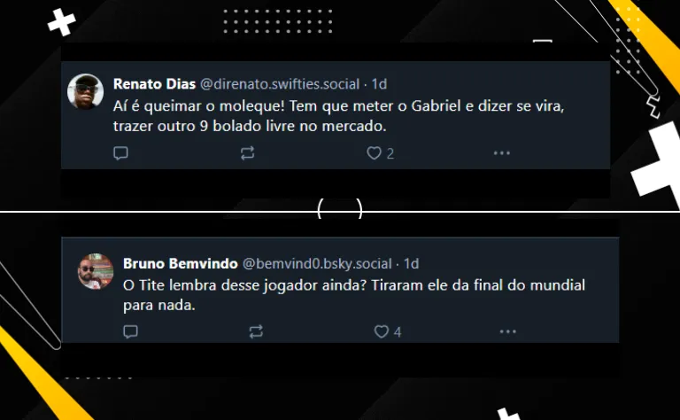 “Só falta o maluco do Tite querer escalar o Lorran de atacante”, opinou um terceiro torcedor. “Aí é queimar o moleque! Tem que meter o Gabriel e dizer se vira, trazer outro 9 bolado livre no mercado”, comentou mais um.