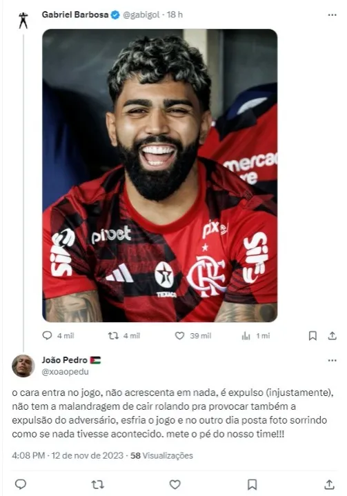 “O Flamengo não vive sua melhor temporada, assim como Gabriel Barbosa, mais conhecido como Gabigol. O atacante de 27 anos foi expulso nos acréscimos da partida contra o Fluminense por fazer uma entrada e posteriormente confronto com Nino, que também foi mandado para o vestiário pelo árbitro”, iniciou.