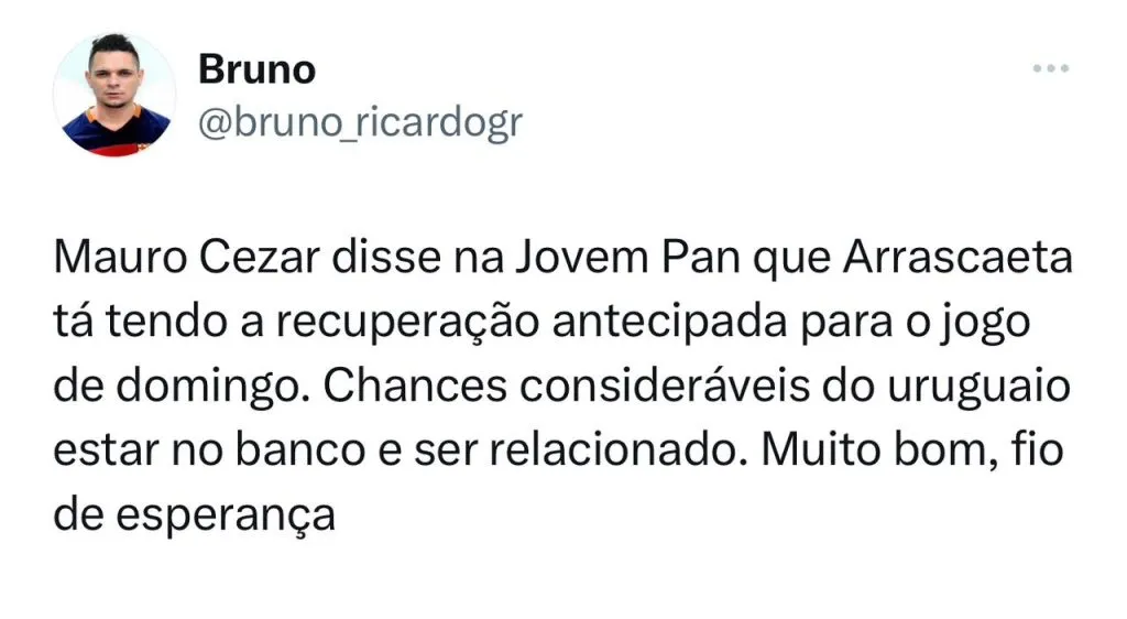 (…) Não deve jogar de saída, não creio, mas acho que a possibilidade dele ficar no banco hoje é razoável eu diria. Ele deve ficar no banco. Eles estão antecipando a recuperação, tem um risco aí de agravar a lesão, mas nessa altura do campeonato… da temporada, depois de uma série de fracassos, eles vão torcer para que o Arrascaeta possa jogar alguns minutos e esteja inspirado. Mais ou menos no jogo contra o Atlético-MG, que ele entrou durante o jogo, ele fez o gol de falta e deu passe para Wesley fazer o gol da vitória (…)”, explicou Mauro na Jovem Pan Esportes.