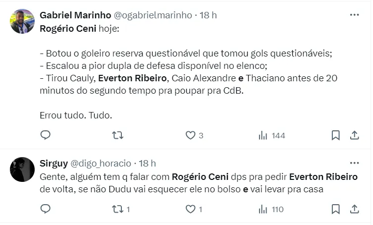“Quem trouxe o Ceni é o culpado! Todo mundo sabia que ele vinha de um trabalho horrível! É um técnico limitado e paneleiro! Não tem nehuma visão de jogo! Ele só tem sorte que o time tem algumas qualidades que resolve jogos. É um Paiva 2.0… Precisamos de um técnico experiente!”, escreveu o torcedor.