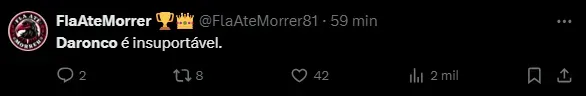“O Daronco é tranquilamente o árbitro mais odioso do futebol brasileiro. Ele inventa 82 mil faltinhas merdas, picota o jogo todo, conversa muito”, “Olha a falta que o Daronco deu. O Ferrerinha se jogou NA FRENTE DELE e ele marcou” e “Nossa senhora, o Daronco qualquer coisa para o jogo“, foram algumas reações.