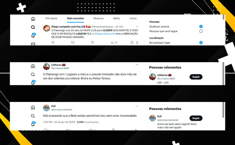 “O Flamengo tem um jogador a mais e o pseudo treinador não abre mão de um dos volantes. Cleber dos Santos é uma herança maldita do Landim. Tem que ser demitido”, cobrou outro flamenguista no microblog.