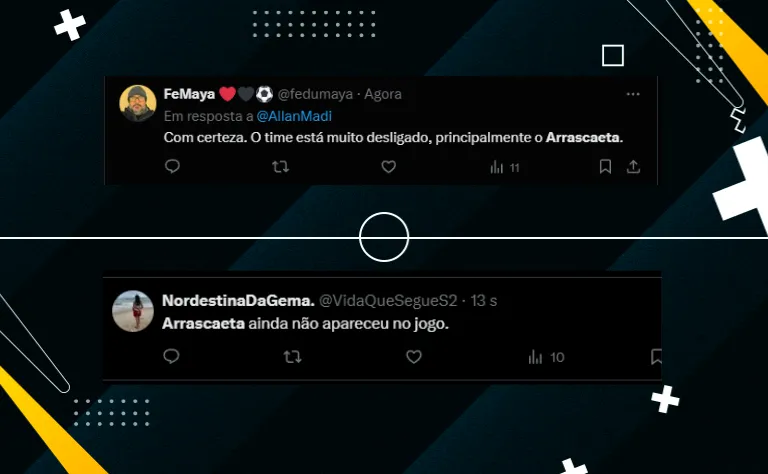 “Arrascaeta ainda não apareceu no jogo“, disse uma torcedora. “Michael, Gerson e Arrascaeta estão mal demais“. Já outro torcedor fez um comentário que chamou atenção: “Quando ele não está bem, o Flamengo sofre nas partidas“.