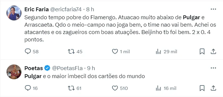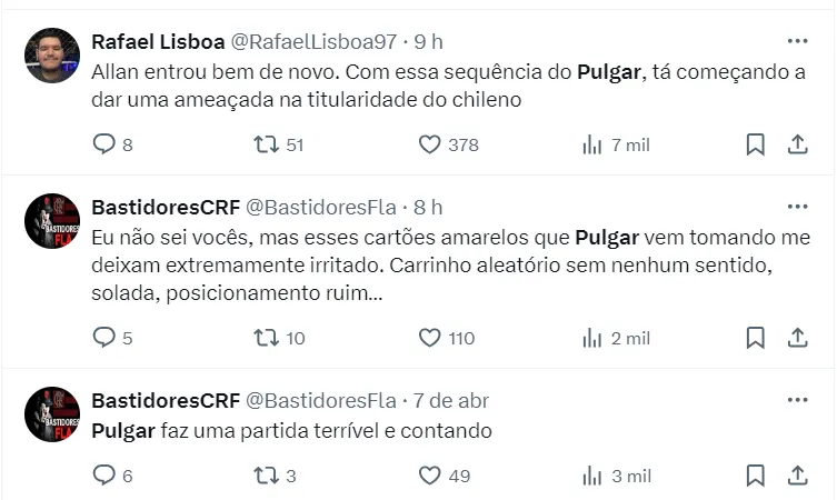 Por conta disso, a torcida se mobilizou nas redes pedindo que Tite dê mais chances a Allan, que vem crescendo em campo. Para que Pulgar tenha mais tempo para se preparar e voltar a apresentar o futebol que é esperado dele.