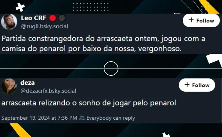 Muitos torcedores usaram a rede social Bluesky para manifestar sua decepção com Arrascaeta. Flamenguistas foram longe e afirmam que o camisa 14 da Gávea teve um desempenho abaixo por ser torcedor do Peñarol.