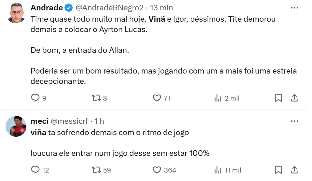 Nas redes sociais, quem sofreu críticas no time titular de Tite foi o lateral-esquerdo Matías Viña. Em noite infeliz, o uruguaio foi aquém do esperado tanto defensiva quanto ofensivamente. O treinador do CRF foi bastante criticado por demorar para substituí-lo.