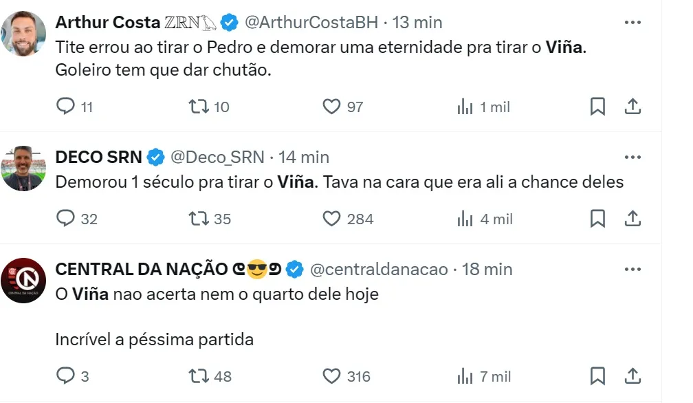 A pressão da torcida colombiana e os efeitos da altitude superior a 2.600m de altura de Bogotá não foram motivos para acalmar os flamenguistas nas redes sociais. Mas quem viu sua orelha ‘esquentar’ de críticas foi realmente Viña, que ainda perdeu um gol claro no início do jogo.