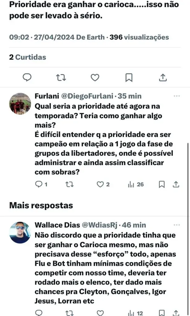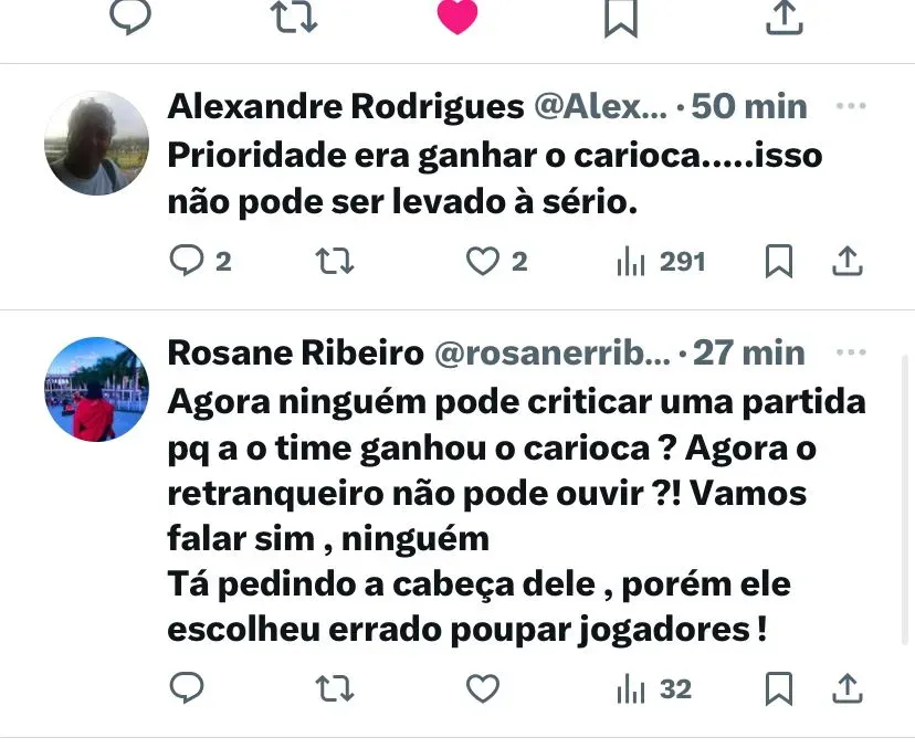 Nas redes sociais, os torcedores se dividiram: (SIC) “A diretoria do Flamengo não segura técnico nenhum. A torcida precisa apoiar se quiser um trabalho”; “Prioridade era ganhar o Carioca? Isso não pode ser levado a sério”, foram alguns comentários.