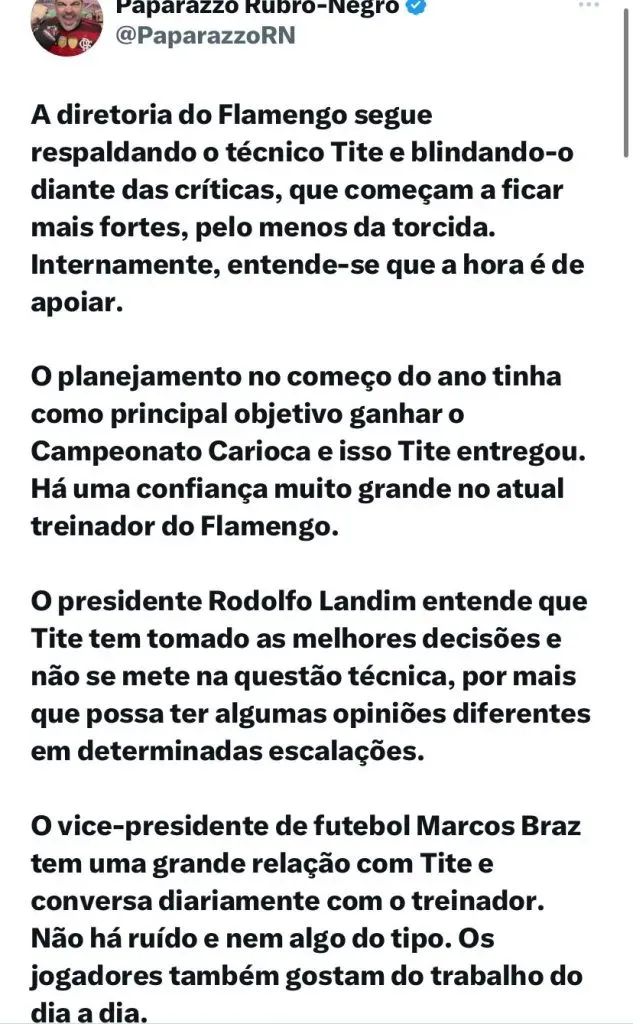 Ainda segundo o Paparazzo Rubro-Negro, a primeira meta do planejamento anual foi atingida quando o time foi campeão do Carioca. Com isso, há uma confiança muito grande no trabalho do comandante.