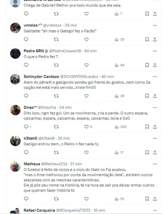 “O futebol é feito de ciclos e o ciclo do Gabi no Fla acabou. “mas o time melhorou por conta da movimentação dele”…existem outros atacantes com as mesmas características. Ele já pôs seu nome na história, tá na hora de sair para deixar entrar outros que queiram fazer história também”, desabafou outro torcedor.