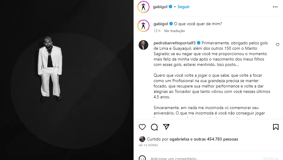 Na publicação, o atacante pergunta “O que vocês querem de mim?”, e isso foi a deixa para os flamenguistas responderem. Um usuário disse: “Que faça gol”, outro comentou: “gols e mais disposição em campo”. Já outro torcedor foi bem mais direto: “dedicar exclusivamente” ao futebol se quiser ter um melhor desempenho.