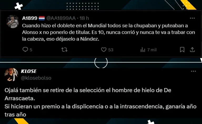 Dentre as publicações, um torcedor apontou que esse desempenho abaixo não é de hoje. “Esperamos que o homem do gelo de De Arrascaeta também se aposente da seleção nacional. Se fizessem um prêmio pela indiferença ou pela inconsequência, ganharia ano após ano”, escreveu.