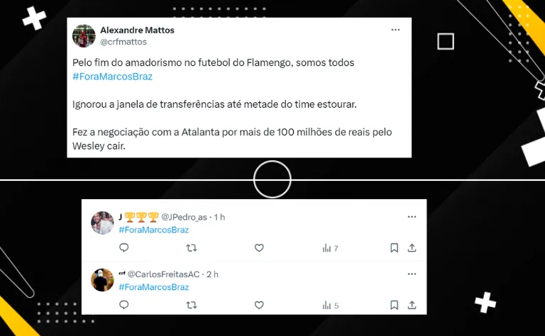 “Pelo fim do amadorismo no futebol do Flamengo, somos todos #ForaMarcosBraz“, disse um torcedor do CRF na rede social do X. Outros torcedores endossaram e afirmaram que ele não pode mais trabalhar no Fla (veja outros comentários ao fim da matéria).