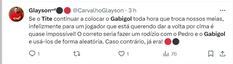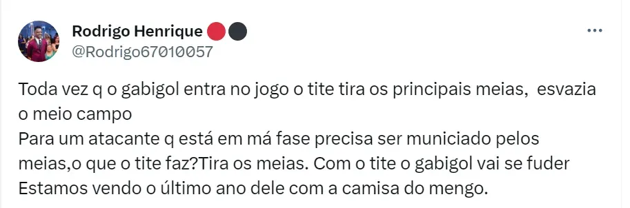 Com isso, os torcedores do Mengão estão afirmando no X que, Gabigol quando entra em campo, Tite tira os meias da equipe e, dessa forma, não tem como o ídolo rubro-negro se destacar nas partidas.
