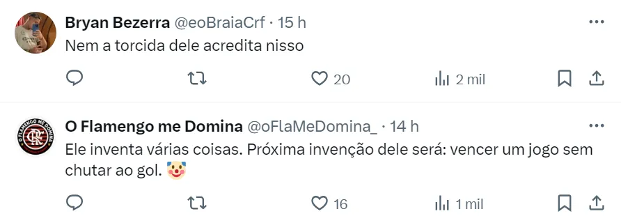 Os torcedores rubro-negros lembraram que o Fluminense não acertou a meta do goleiro Rossi durante os 180 minutos do clássico e o treinador do Flu virou motivo de piada e foi muito criticado no X (antigo Twitter).