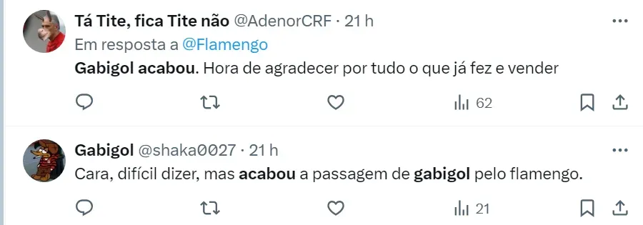 No X, antigo Twitter, muitos torcedores afirmam que o ciclo de Gabigol no Flamengo se encerrou e a diretoria deveria agradecer e fazer negócio no mercado da bola. O vínculo do jogador se encerra em dezembro.